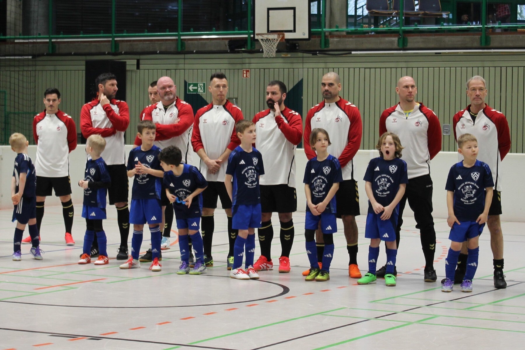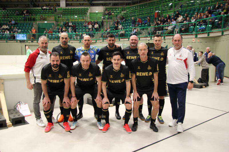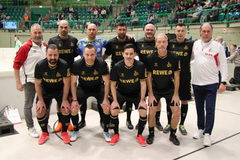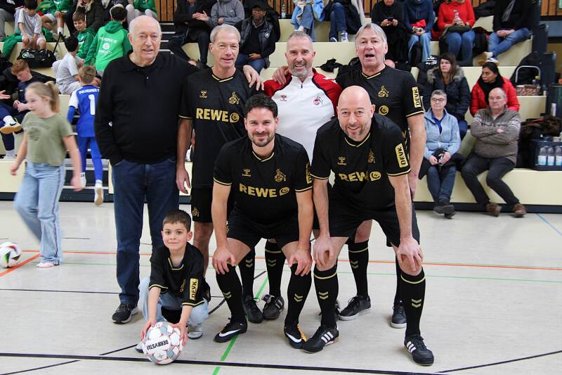 Gemeinsames Mannschaftsbild beim Einlagespiel zugunsten der Kinderkrebshilfe in Hennef (01.02.2026)